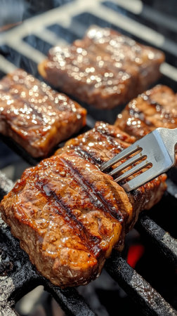 Fresh beef steaks being fried or prepared with grill or BBQ with pepper, spices and spices.