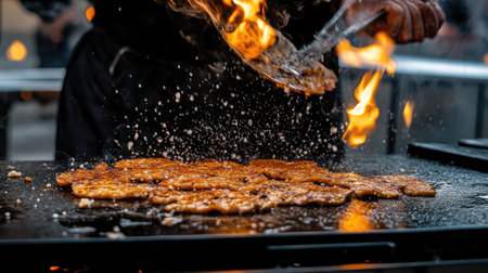 A chef expertly prepares crispy pancakes over a sizzling griddle, with flames dancing and splashes of oil creating a vibrant culinary scene.