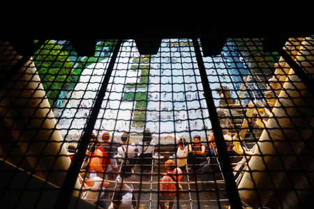 Iron fence in vertical, horizontal lines against a blur sky background. Wire meshed in rectangle shapes for security or safety concept. The texture of window patterns or dark silhouettes of a gate