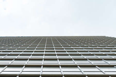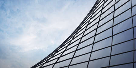 Geometry and lines of a modern business center. Clouds are reflected in the glass windows of a high-rise skyscraper of a modern commercial city of the future