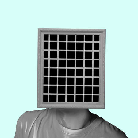 Contemporary art collage. Man with frame head isolated over light mint background. Introvert life. Optical illusion concept