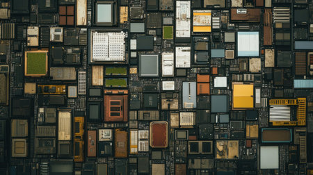 An abstract representation of microchips and electronic components arranged in an intricate pattern. This high-resolution image highlights various shapes and textures that emphasize innovation and technology. Perfect for tech-related themes.