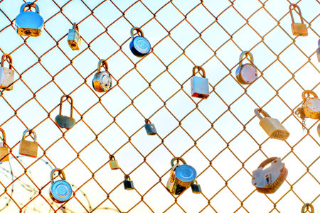 Assorted padlocks of different shapes and sizes hanging on a chain link fence, illuminated by the soft, warm light of a beautiful sunset. Relationships, weddings and love related concept.