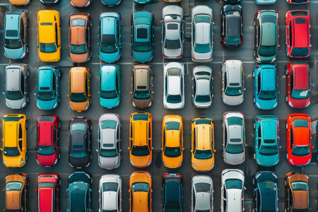 Aerial view of a large parking lot filled with numerous cars in various colors, showcasing urban vehicle storage dynamics