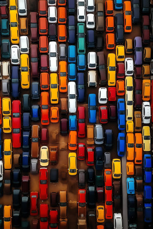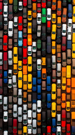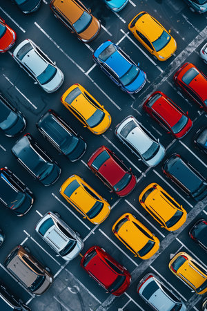 Aerial view of parking lot with colorful cars