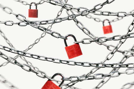 Chains with red closed padlocks. Concept of protection and safety. Abstract background.