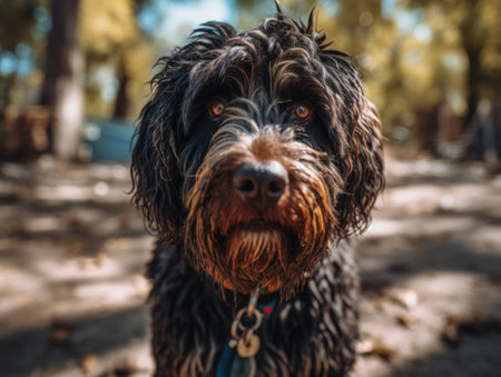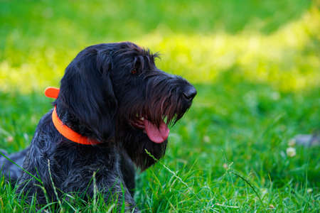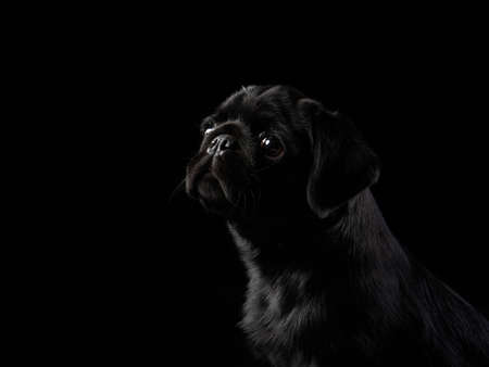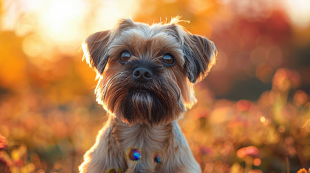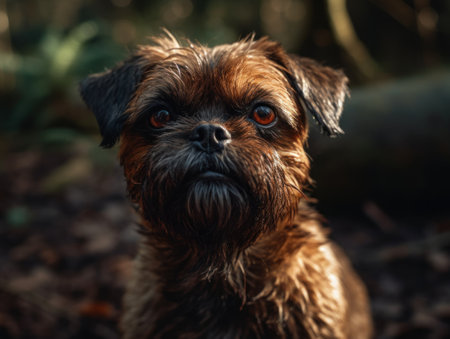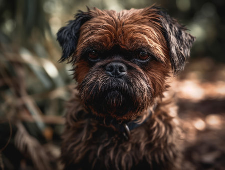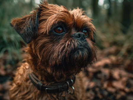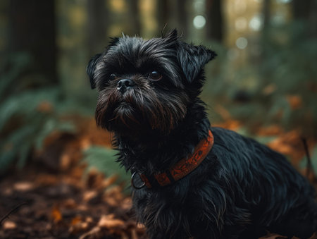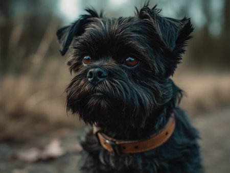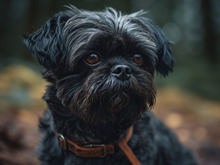 Portrait of a black small wire-haired dog of the Belgian Griffon breed outdoors in the forest on a background of nature in blur in autumn