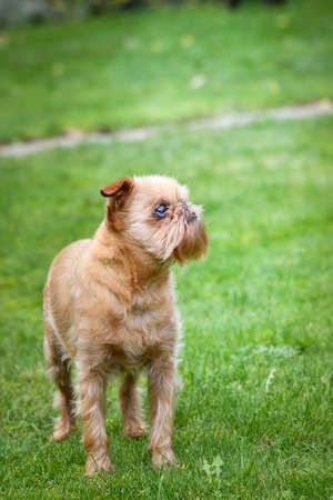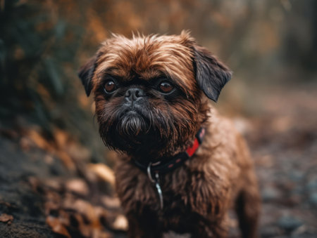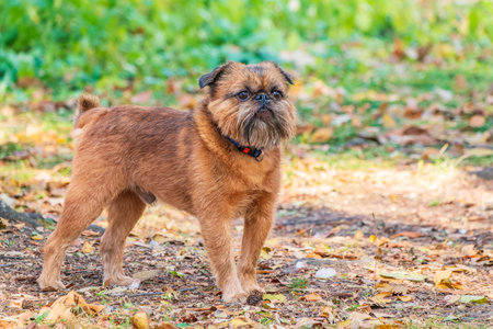Brussels Griffon for a walk in the park. Funny brussels griffon dog walking on leaves at sunny day in forest