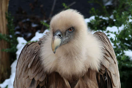 A portrait head shot of an endangered Himalayan Griffon vulture in captivity in a zoo.