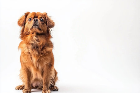 Tibetan Spaniel displays its fluffy coat and short legs while sitting gracefully, embodying the breeds playful spirit and affectionate nature against a stark white backdrop.