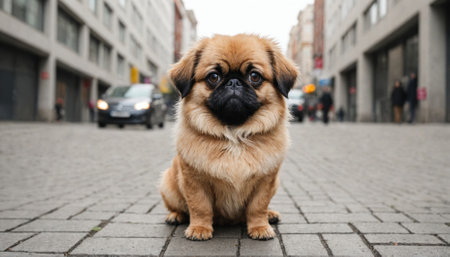 A small, brown dog sits patiently on a city sidewalk, looking directly at the camera