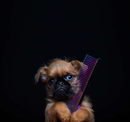Smooth-haired Brussels griffon on a gray background after a haircut in the animal salon