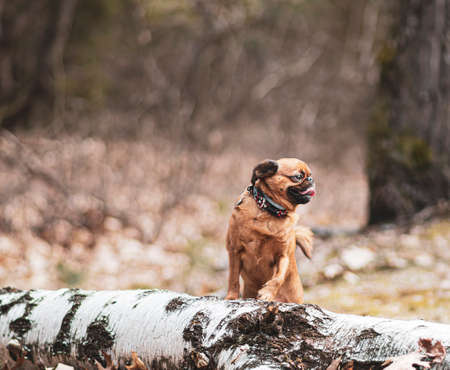 Small brown dog standing on a birch log. Funny facial expression of a pet posing in the forest, Poland. Selective focus on the details, blurred background.