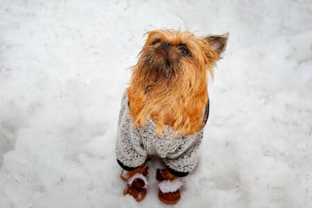 Small shaggy brown dog on the white snow in winter day. Pet Brussels Griffon on a walk outdoors