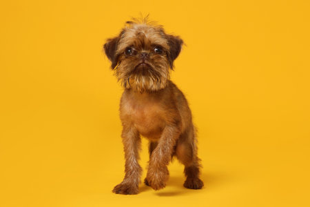 Studio portrait of funny Brussels Griffon dog lying on sofa