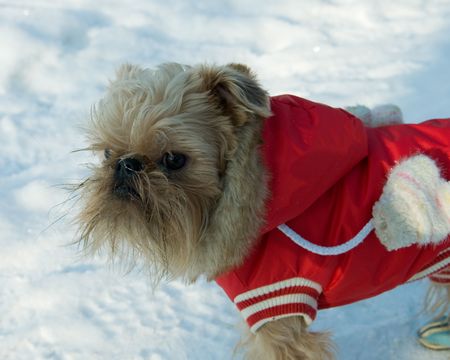 Puppy of the Brussels griffin in a winter jacket and warm boots.