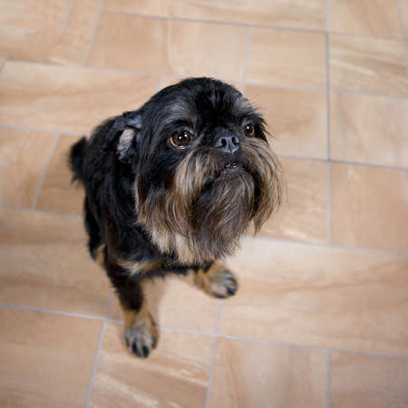 Dog of breed the Griffon Bruxellois after grooming. The doggie is dressed in a striped vest