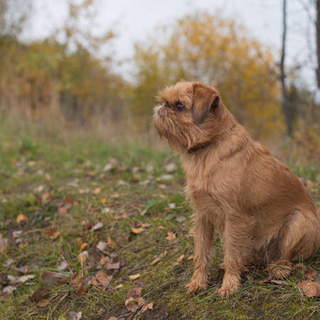 brussels griffon sits at the edge of the forest, looks into the distance, lonely, brooding, abandoned, autumn, landscape, small ginger dog