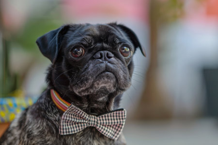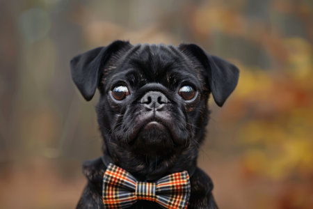 A stylish pug dog wearing glasses and a bow tie, exuding charm and personality in a playful pose. A quirky pug wearing a bow tie, AI generated