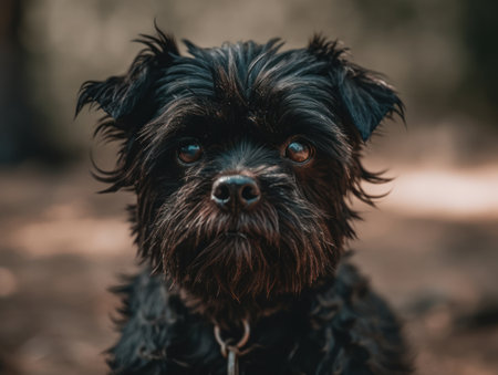 Portrait of a black small wire-haired dog of the Belgian Griffon breed outdoors in the forest on a background of nature in blur in autumn