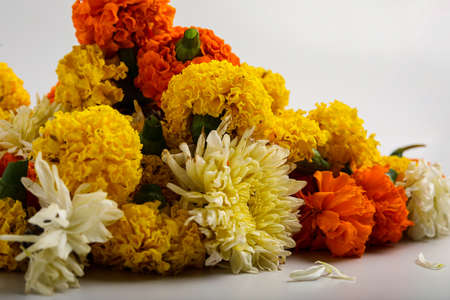 Flower Rangoli for Diwali Festival made using Marigold and leaf and Oil Lamp over white background,