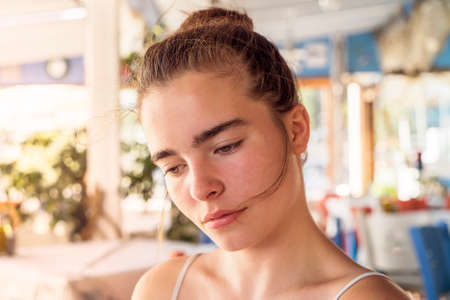 Beautiful young woman at the ocean standing against a turquoise blue sea with her hair blowing in the breeze.