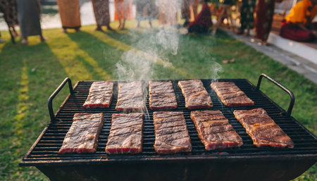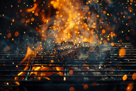 Flames dance above a grill filled with sizzling meats capturing the essence of a vibrant backyard barbecue on a warm summer evening surrounded by friends and laughter.