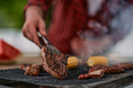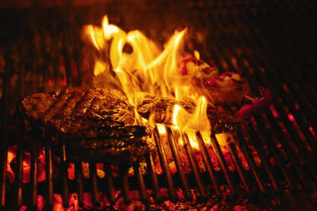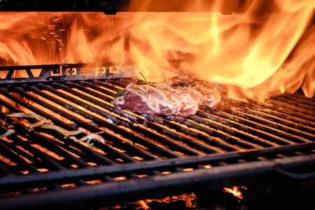 Juicy beef steak flips in a barbecue flame, life style, food photo, copy space.