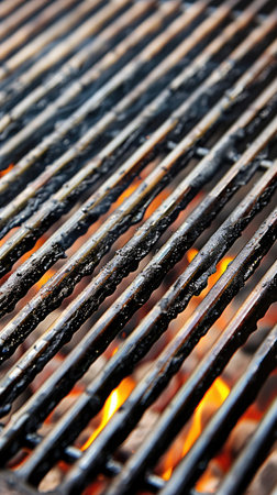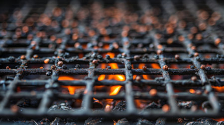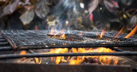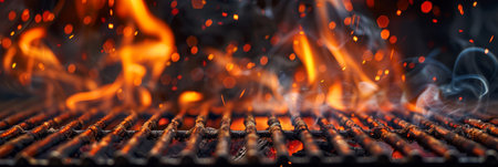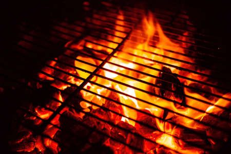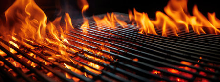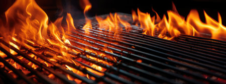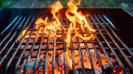 Closeup of hot barbecue grill with flames and coals, ideal for summer parties and outdoor gatherings