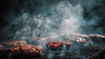 Barbecue grill smoke surrounds juicy silhouettes of burgers, capturing the essence of outdoor cookouts and gatherings during summer holidays.