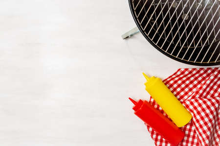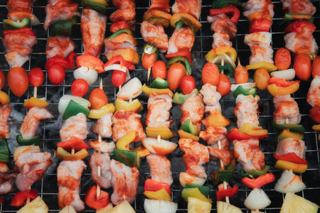 Flat lay above chicken white breast meat on the barbecue grill with kebabs.