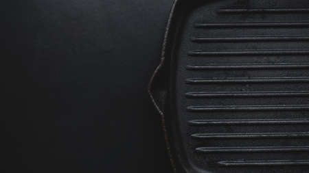 New empty cast-iron grill pan with two handles on wooden background. place for text. Flat lay top view black cast iron skillet for barbecue. Food Mockup