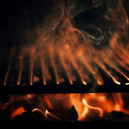A close-up image of a grill with vibrant flames and rising smoke, capturing the essence of outdoor cooking. The flames dance and flicker, while the smoke curls upwards, creating a dynamic and inviting scene.