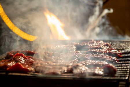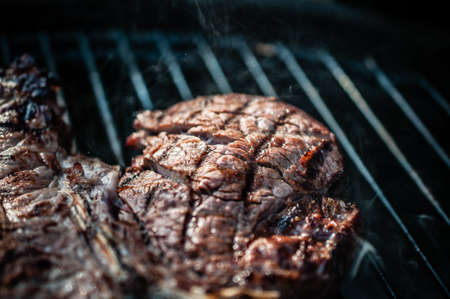 in the evening, delicious juicy steaks on an open fire are grilled on a barbecue grill. close-up, soft focus. smoke is highlighted