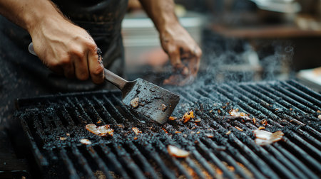 A chef skillfully grills various cuts of meat over a hot fire producing flames and smoke. The atmosphere is filled with the aroma of cooking meat typical of summer barbecues.