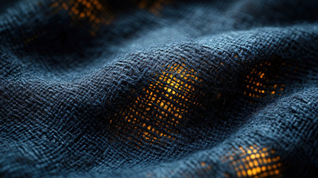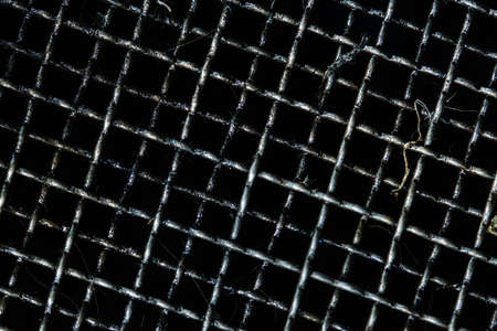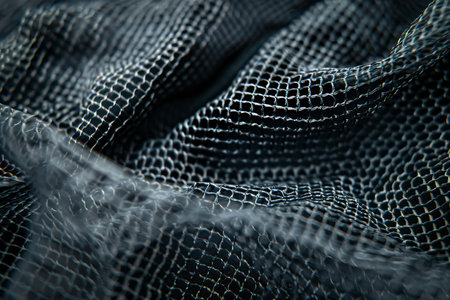 A closeup of the texture and pattern on black mesh fabric, highlighting its gridlike structure with white netting against a dark background. the focus is sharp to capture every detail in high resolution