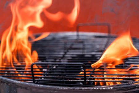 Empty flaming charcoal grill with open fire, ready for steak preparation barbecue concept with selective focus.