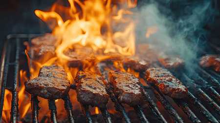 A close-up of juicy meat grilling over vibrant flames, showcasing sizzling texture and rich flavor. Perfect for summer barbecue and food preparation themes.