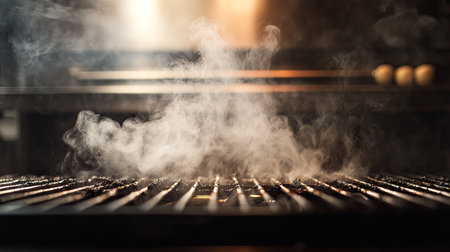 Steam escaping from the exhaust of a cooking grill, with the smoke and steam mingling to create a dynamic and appetizing culinary scene.