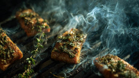 An enticing display of grilled salmon fillets seasoned with fresh herbs, creating a smoky flavor on the barbecue grill. Perfect for food lovers.