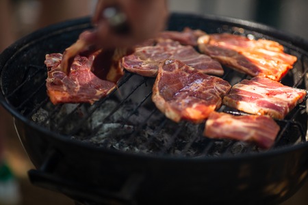 Barbecue in the forest.shashlik at nature. Process of cooking meat on barbecue, closeup. Barbecue with meat in metal grate, closed-up in forest with grass