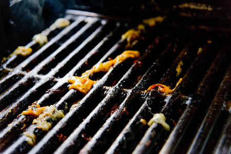 A close up view of a hot grill with flames visible through the grates. The grates are black with char from previous use.
