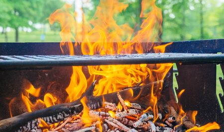 BBQ grill with burning wood and fire flames. Empty hot charcoal barbecue grill with bright flame