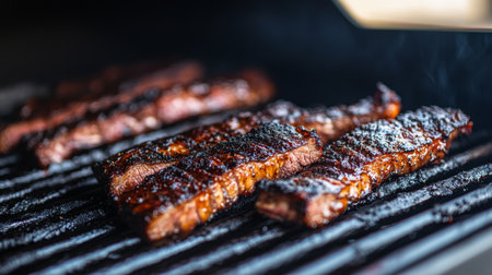 Bacon strips resting on a grill, with char marks and sizzling fat, creating a smoky, crispy texture under the heat.