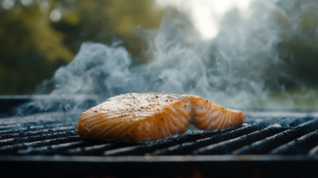 A minimalist shot of a single salmon steak sizzling on a grill, with smoke rising and a light sear on the fish, set against a blurred outdoor background.