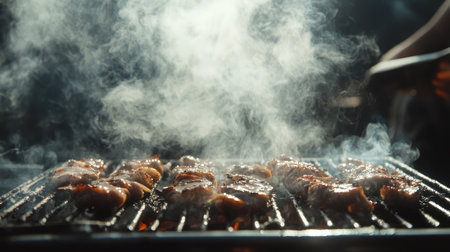Detailed view of smoke emerging from a barbecue grill, with sizzling food and a smoky atmosphere