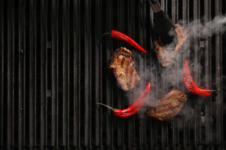 Tasty beef brisket with chili pepper in smoke on barbecue grill