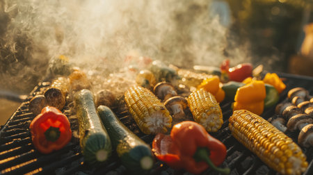 A variety of fresh vegetables, including corn, peppers, and zucchini, sizzle on a grill, producing aromatic smoke during a cozy summer evening barbecue.