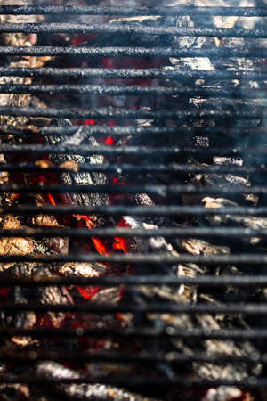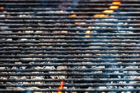 Hot empty barbecue BBQ grill with flaming fire and ember charcoal