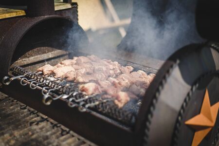 Grilled kebab cooking on metal skewers (grill). Roasted meat cooked at barbecue with smoke. Close up BBQ fresh pork meat chop slices. Traditional eastern dish, shish kebab. Grill on charcoal and flame, picnic, street food. Toned, style, classic photo.